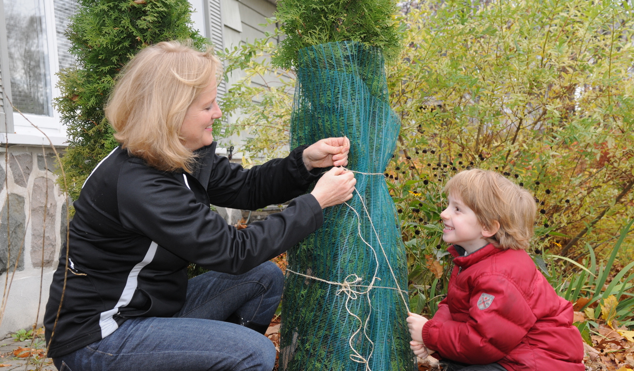 Selon leur emplacement et leur âge, certains arbres et arbustes gagnent à être mis à l’abri. S’ils sont exposés au jet de la souffleuse, protégez leur tronc d’un madrier de bois. Au préalable, ficelez les branches pour éviter qu’elles ne cassent lors du dégel.