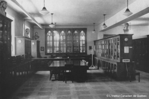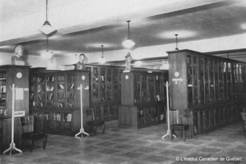 La centrale de la Bibliothèque de Québec en 1948 dans le temple Wesley. Photo : Office provincial de publicité du Québec, collection de L'ICQ.