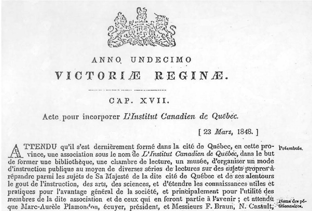 Fondé le 23 mars 1848, l’Institut canadien de Québec est le plus ancien organisme culturel francophone encore actif en Amérique. C’est également un 23 mars, mais cette fois-ci en 1898, lors des célébrations du 50e anniversaire de L’ICQ, que la première bibliothèque publique de Québec a été inaugurée dans les locaux mêmes de l’hôtel de ville.