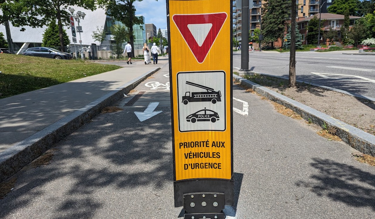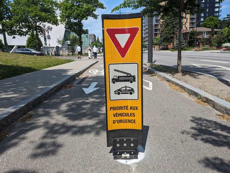En comparaison aux dos d’âne, la balise centre-rue ne génère pas de bruit et elle ne limite pas la vitesse des véhicules d’urgence. Son utilisation est réservée à la période estivale seulement, car elle est incompatible avec le grattage de la neige.