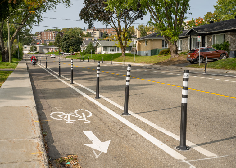 Utilisées seules ou en complément d’une autre balise, les bordures séparent habituellement les voies de circulation des pistes cyclables.