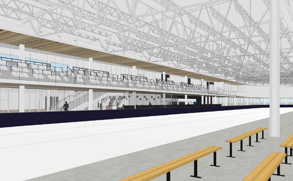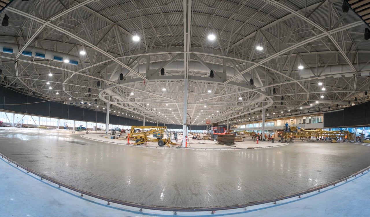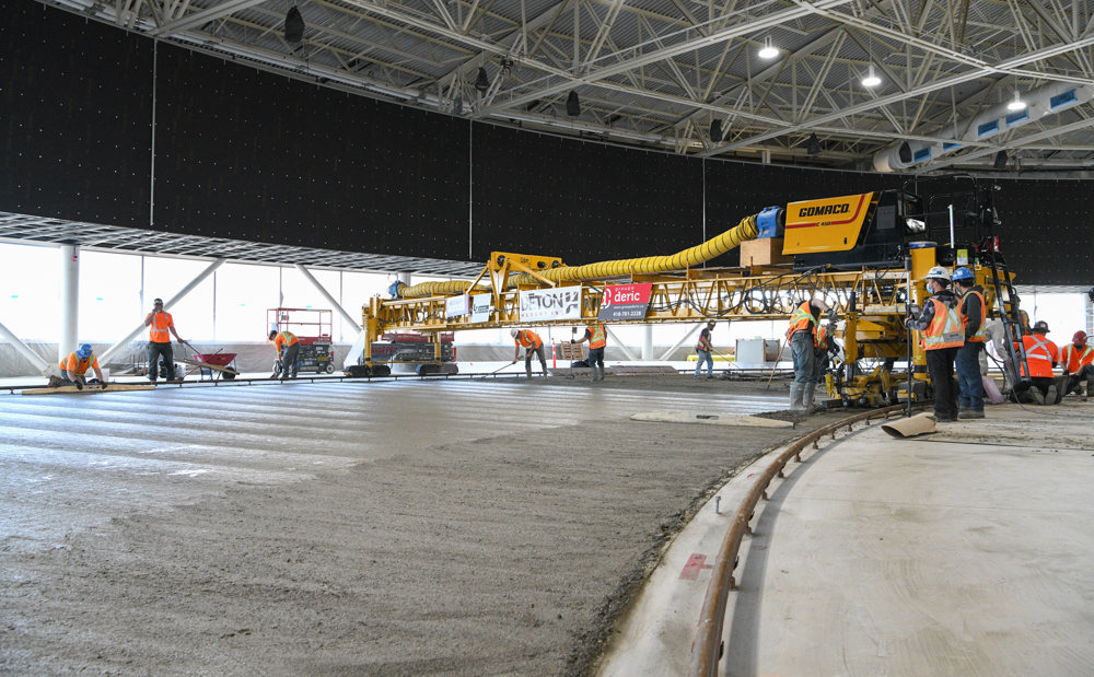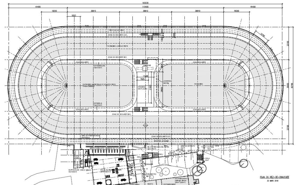 La coulée de la dalle de béton de l’anneau de 400 mètres a duré 19 heures, mobilisé une cinquantaine de travailleurs et nécessité 800 m3 de béton. Une belle prouesse d’ingénierie!