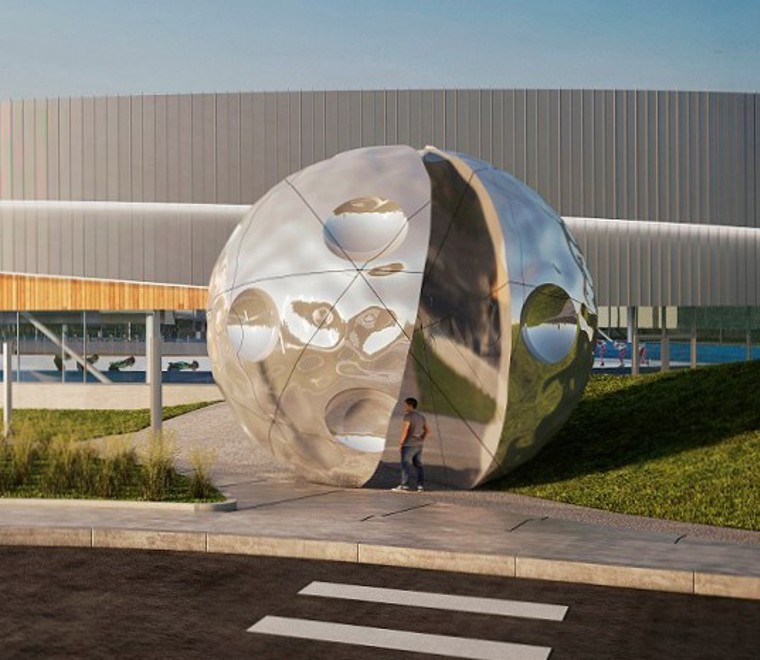Dans l’entrée principale, vous pourrez admirer une sculpture imposante, de forme sphérique, de l’artiste de Québec Marc-Antoine Côté. Intitulée Facteur-vitesse, et le bleu du ciel est à l’envers, l’œuvre en aluminium poli se déploiera sur une hauteur de 6,4 mètres.