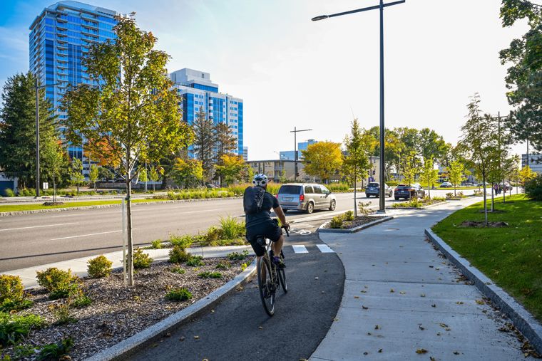 Le boulevard Hochelaga est un exemple concret d’un tronçon routier convivial. Réaménagé de 2020 à 2022, 1 950 mètres de piste cyclable quatre-saisons et 402 nouveaux arbres ont été ajoutés ! Ce boulevard offre maintenant une voie sécuritaire pour marcher et se déplacer à vélo en toutes saisons, en plus d’offrir un cadre verdoyant.